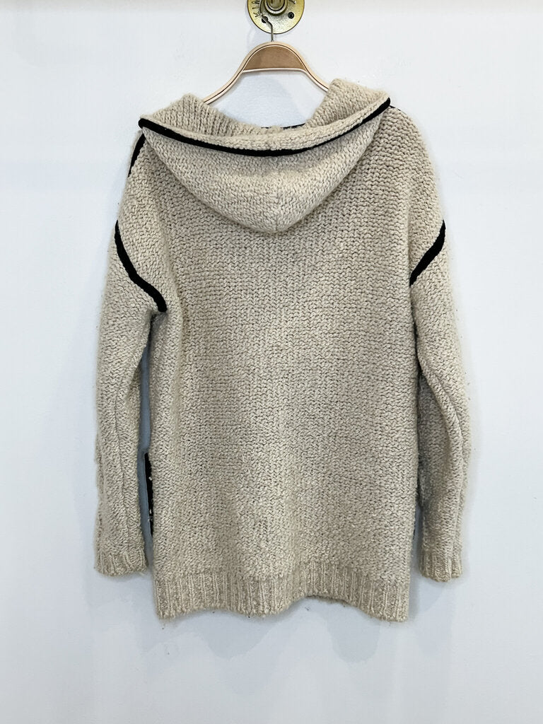 Cable Knit Wool-Alpaca Zip Front Hooded Sweater with Leather Trim, size 4 (FR 36)