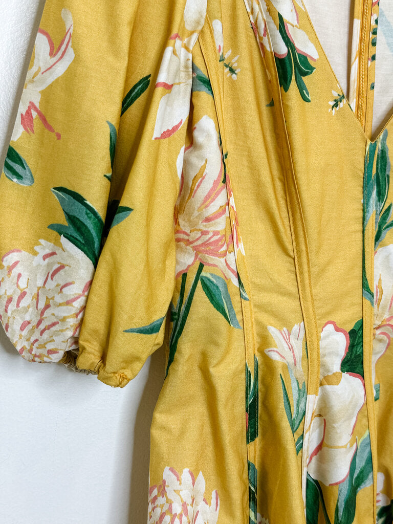 Chrysanthemum Puff Sleeve V-Neck Midi Dress with Corset Details, size M