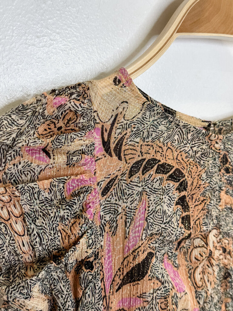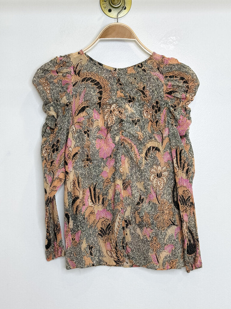 Floral Silk-Cotton Blend Micro Pleated Long Sleeve Blouse with Metallic Gold Threads, size 0