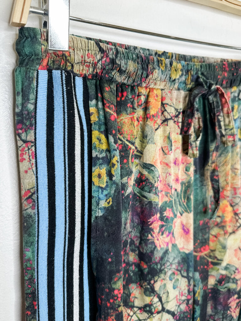 Floral Silk Wide Leg Drawstring Pants with Tuxedo Striping, size XS