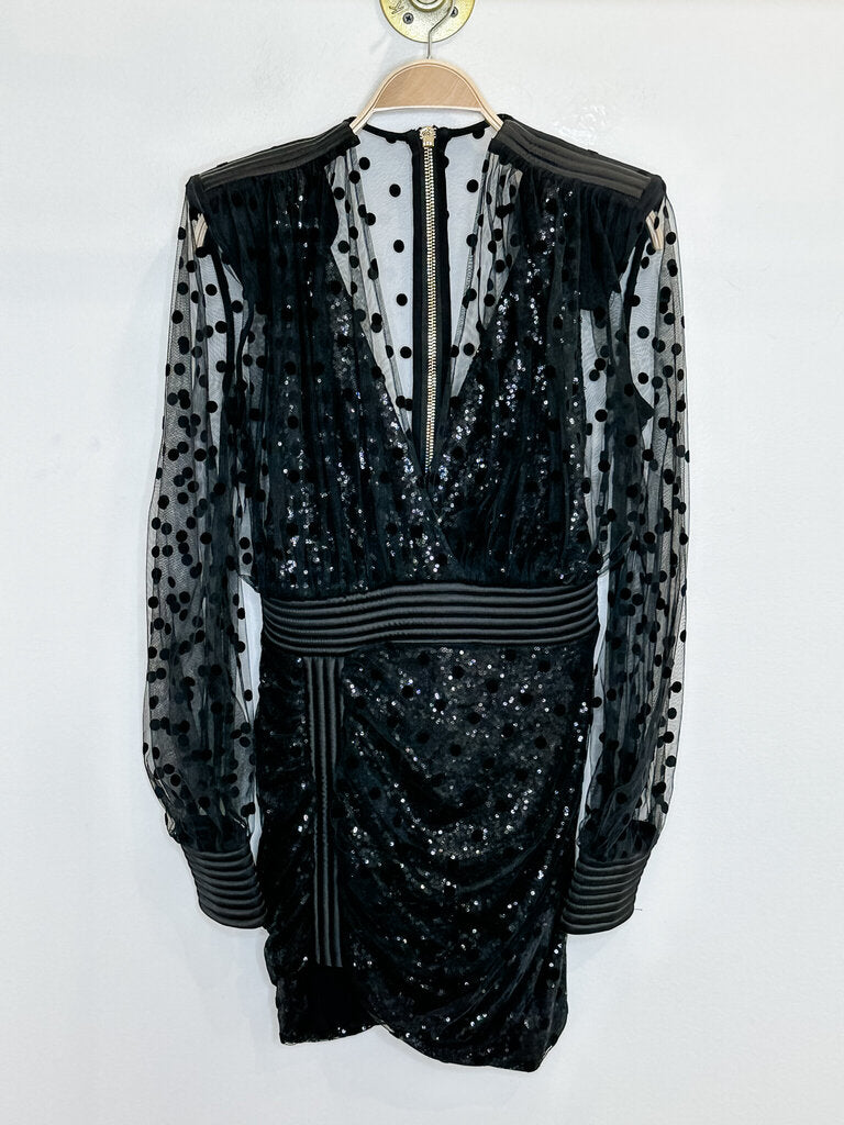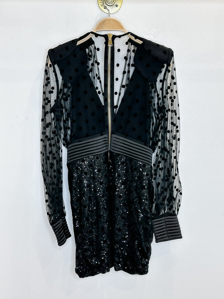 Sequin + Polka Dot Mesh Long Sleeve Mini Dress with Shoulder Pads, size 6