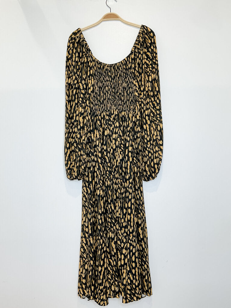 Wheat Print Long Sleeve Maxi Dress with Shirred Bodice + High Slit, size S